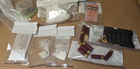 During the search of the vehicle police located 60 rounds of ammunition and what is believed to be 288.18 grams of methamphetamine 8.18 grams of cocaine, 8.16 grams of crack cocaine and Canadian currency.