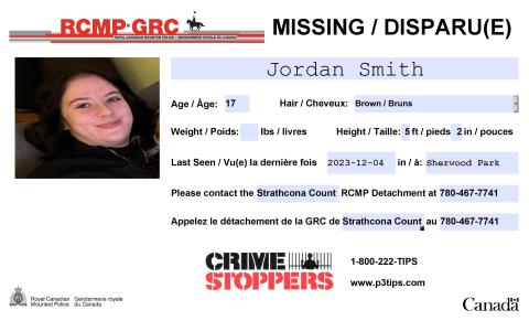 Strathcona County, Alta. – Strathcona County RCMP are seeking public assistance in locating missing 17-year-old Jordan Smith. Jordan was last seen in person on Dec. 4, 2023 in Sherwood Park, Alta. Strathcona County RCMP are concerned for her well-being and would like to speak with her.