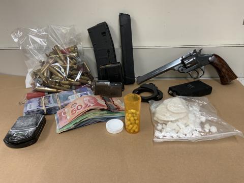 During the search police seized several items including what is suspected to be over 120 grams of cocaine, .22 loaded revolver handgun, ammunition drug paraphernalia, stun gun and Canadian currency.