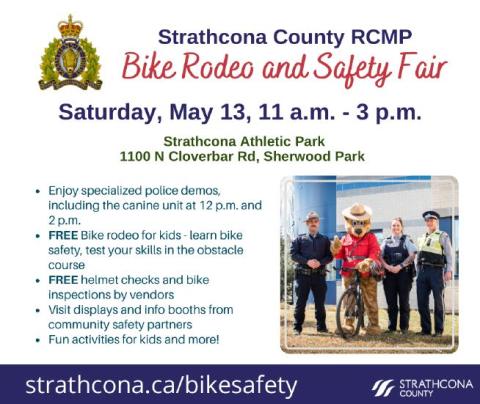Strathcona County, Alta. – The Strathcona County RCMP will be hosting their annual kids bike rodeo and safety fair on Saturday, May 13, 2023 at the Strathcona Athletic Park located at1100 Cloverbar Road in Sherwood Park, Alta.